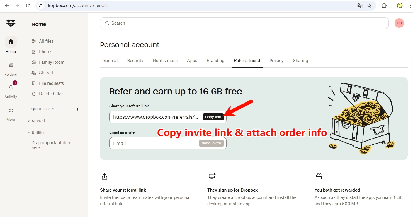 This service is based on the Dropbox’s public referral program. We complete the referral tasks on your behalf to help increase your Dropbox storage from 2GB to 18GB permanently.